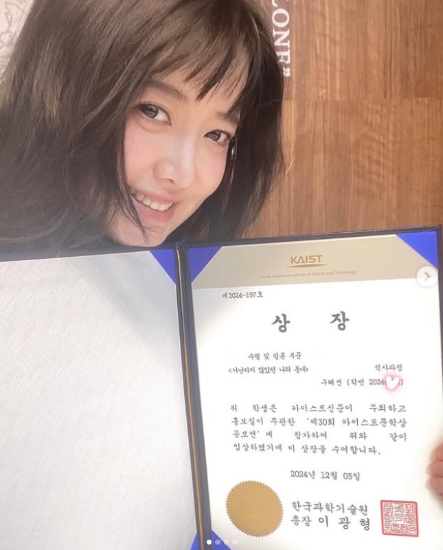 구혜선은 성균관대학교 영상학과를 수석 졸업한 후, 카이스트 과학저널리즘 대학원에서 공학 석사 과정을 밟고 있습니다. 그녀는 카이스트 화학과 이해신 석좌교수와 함께 '펼치는 헤어롤'을 공동 개발하였습니다. 이 제품은 기존 헤어롤의 부피와 휴대성 문제를 개선하고자 하는 실용적인 아이디어에서 출발하였습니다.