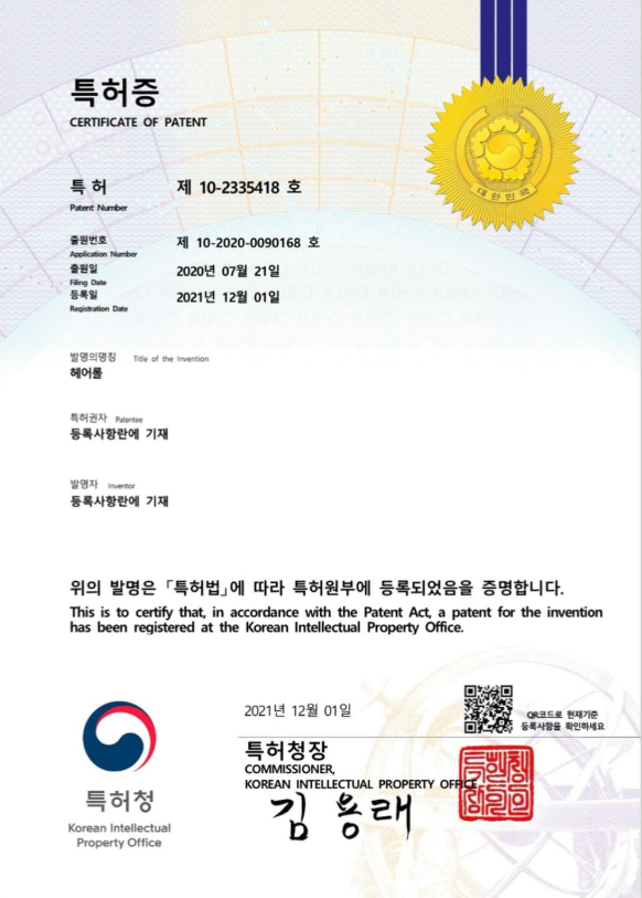 - 특허 특징: 기존의 원형 헤어롤과 달리, 납작한 직사각형 형태로 휴대가 간편하며, 사용 시 원하는 크기로 구부려 사용할 수 있는 구조